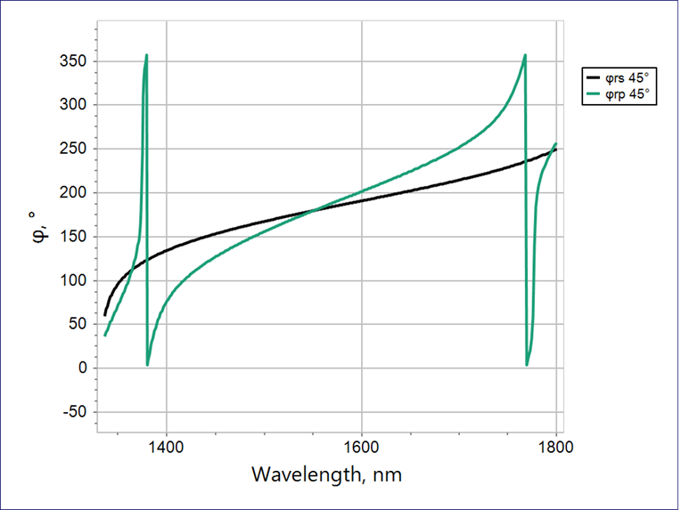 To achieve ultra-high reflectivity at the target wavelength, a 6.6 µm multilayer dielectric coating was designed and applied. The coating delivers greater than 99.9 % reflectivity for both S- and P-polarizations at 1550 nm, while ensuring negligible phase difference (φₛ ≈ φₚ). This polarization-insensitive behavior is critical for preserving signal uniformity across the full aperture of the LiDAR system.